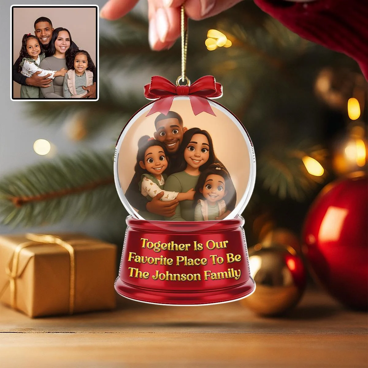 Cherish family memories with our Personalized Family Ornament. This delightful decoration features a custom animated family photo inside a snow globe, with the text “Together Is Our Favorite Place To Be” and custom name making it a perfect holiday keepsake.
