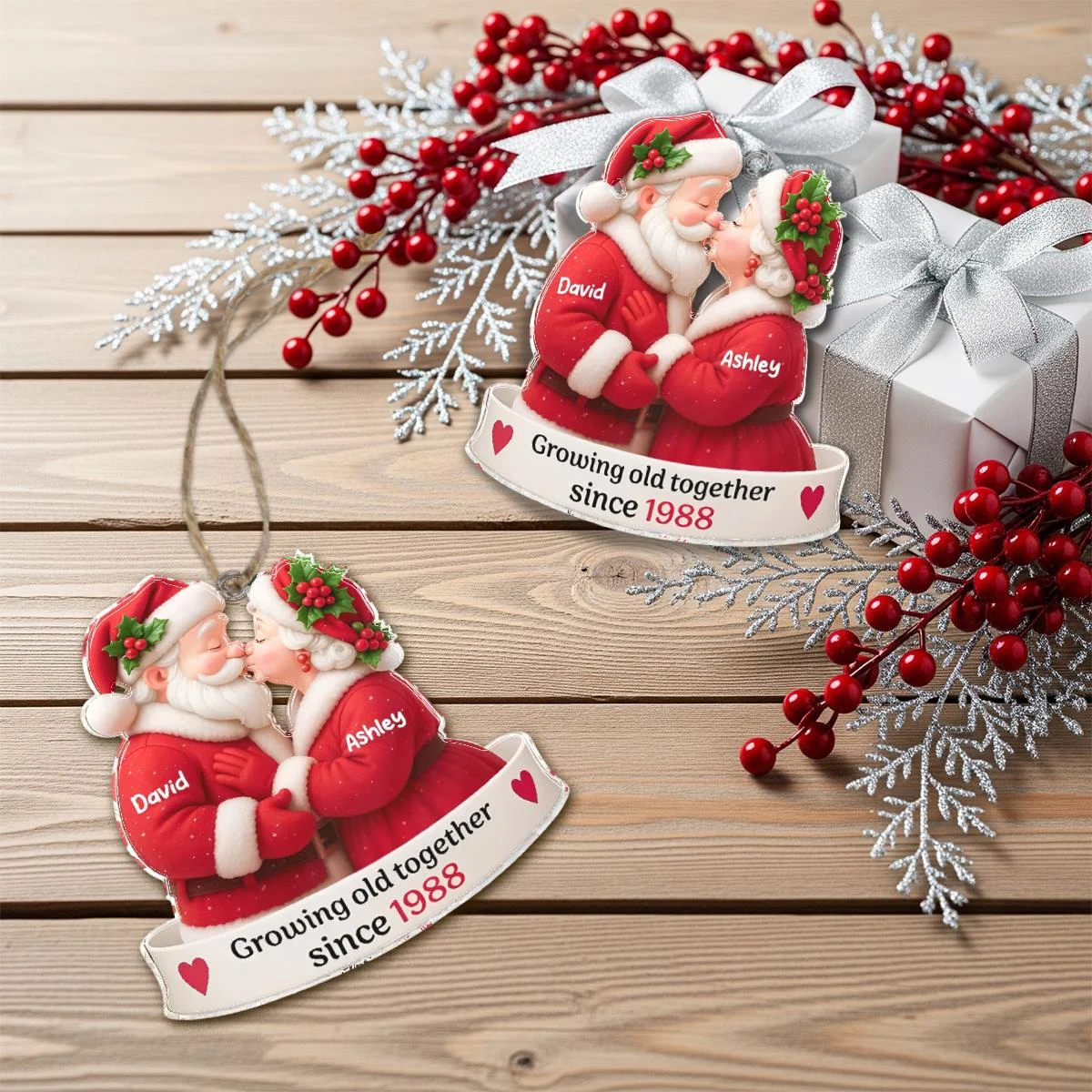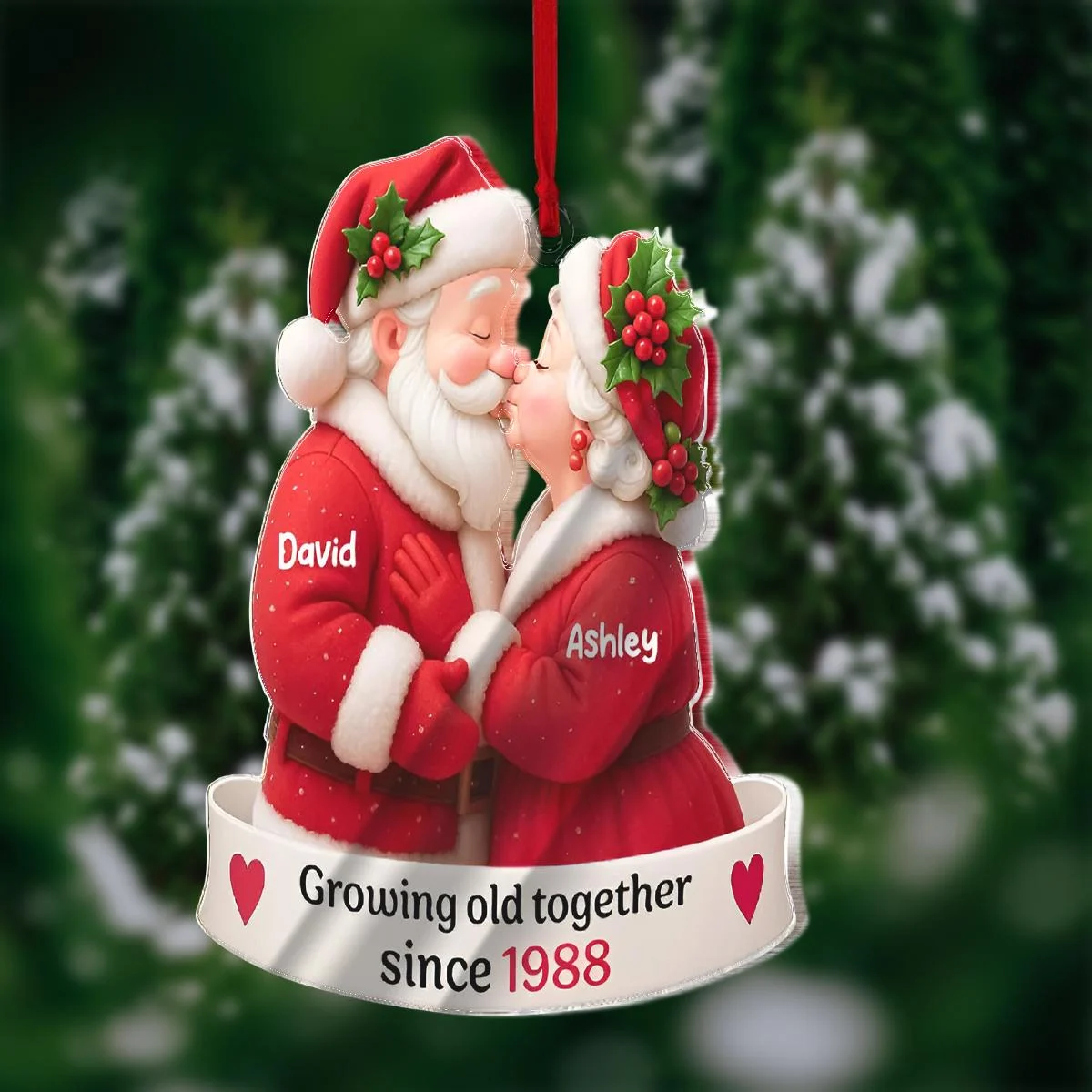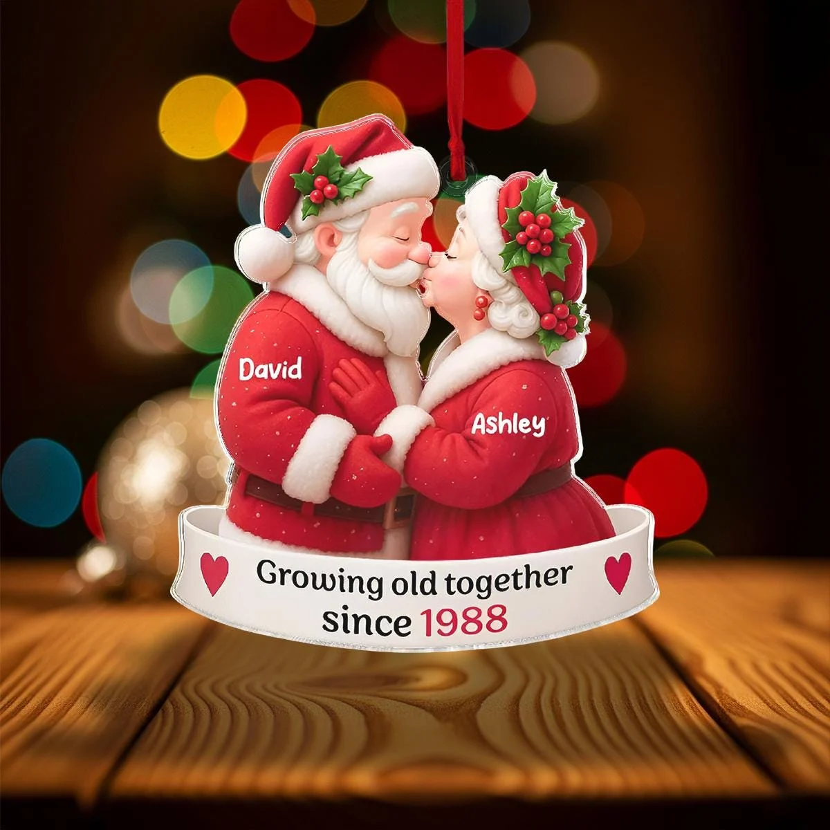 Celebrate enduring love with our Personalized Santa Couple Ornament. This heartwarming decoration features a Santa and Mrs. Claus sharing a kiss, customizable with names like David and Ashley, and the year 1988, making it a perfect keepsake for a lifetime together since then.