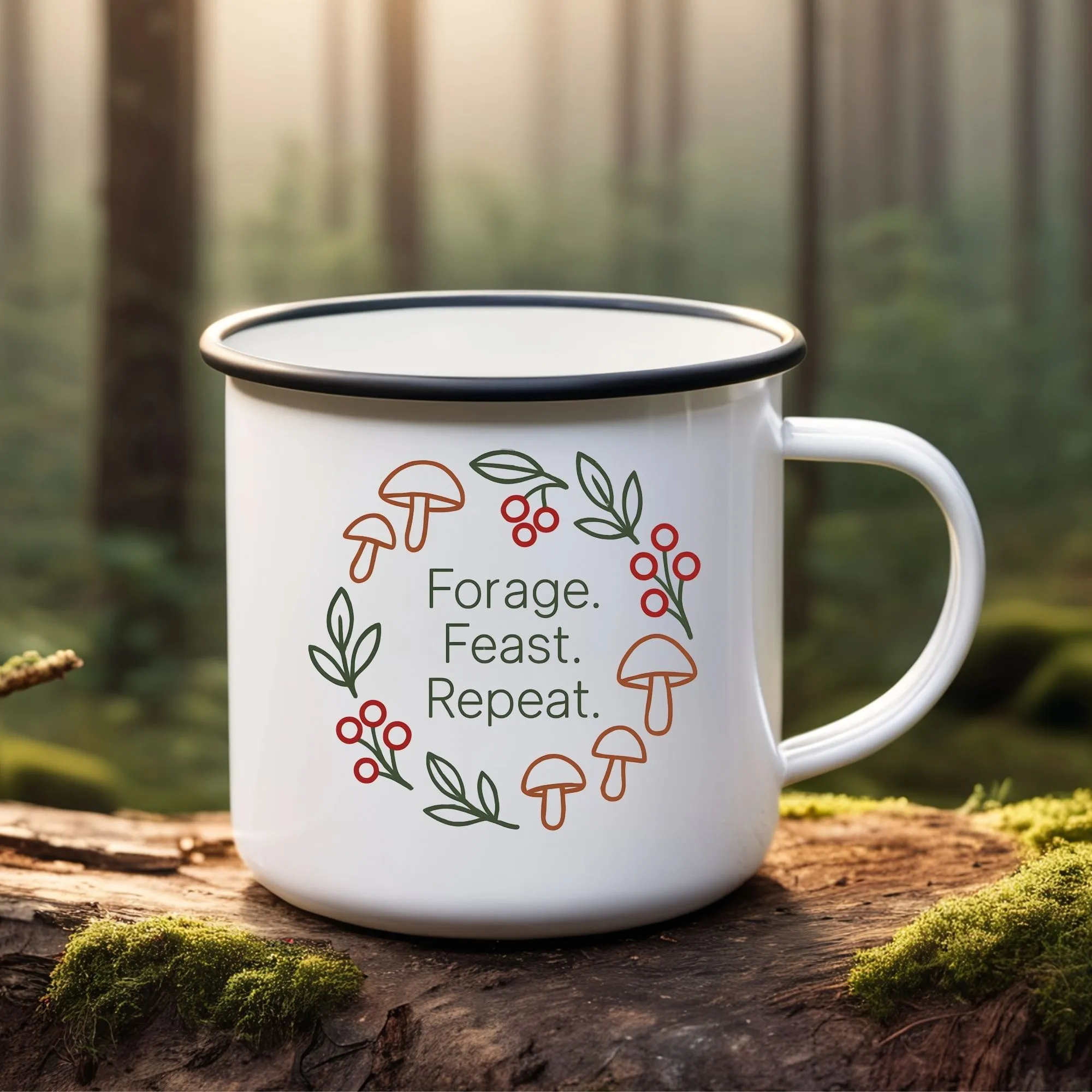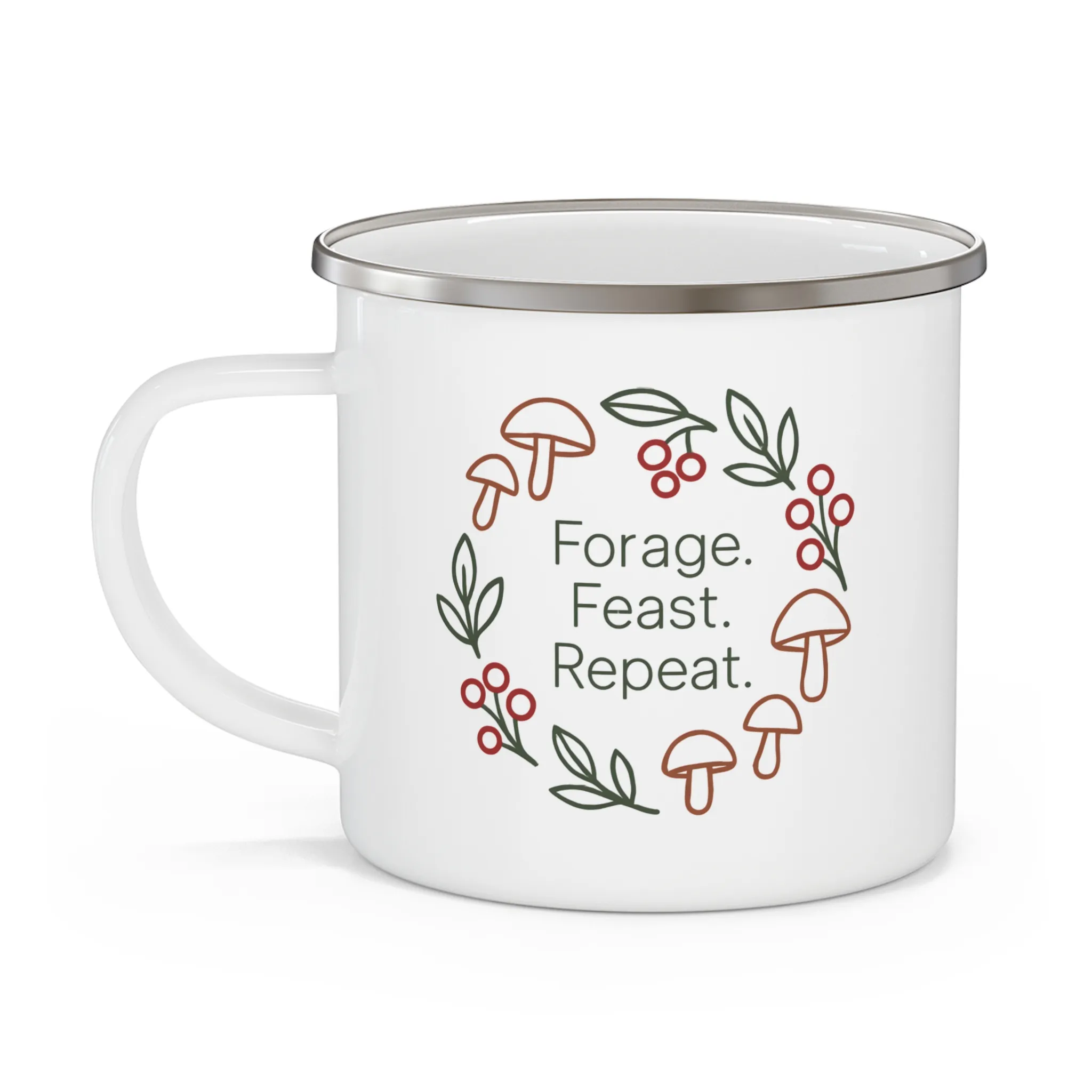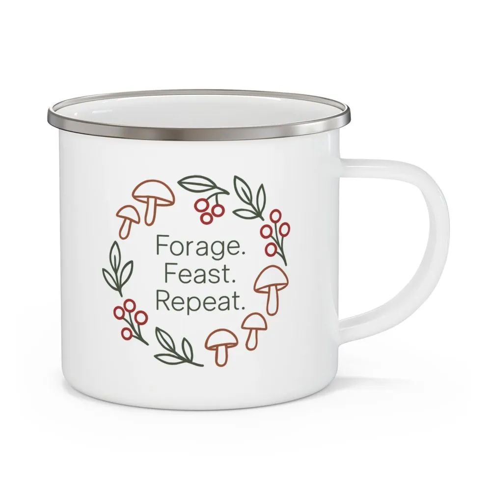 Forage Feast Repeat Enamel Mug – Minimalist Mushroom & Berry Design
