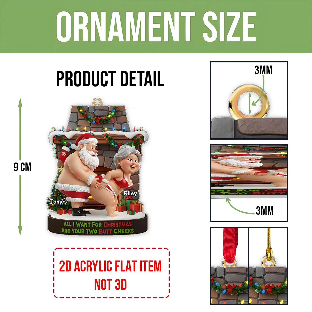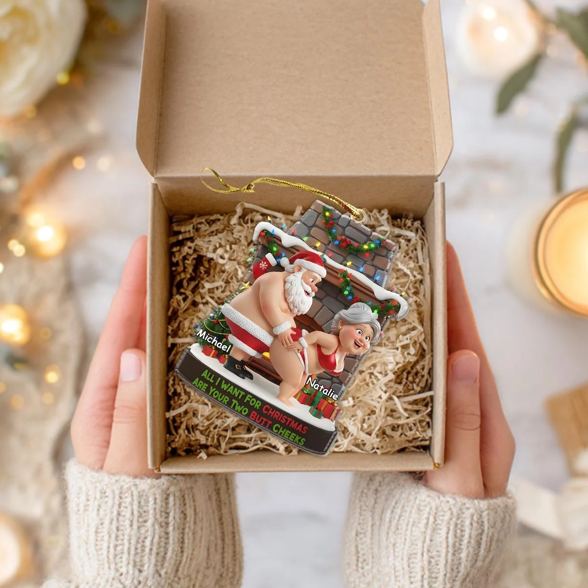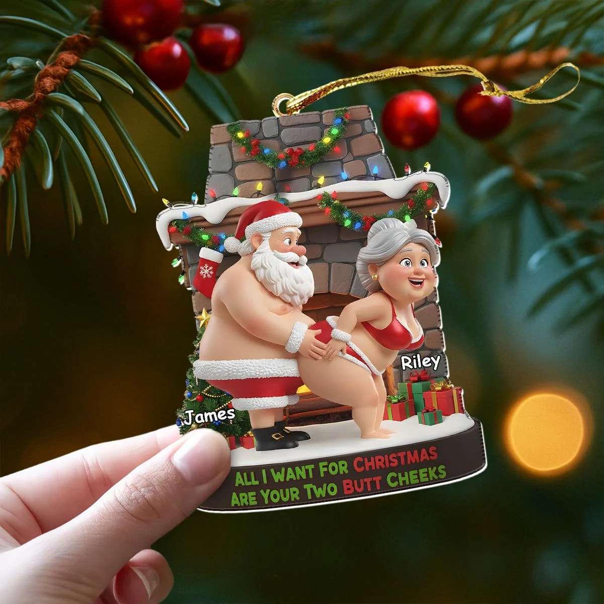 Add a cheeky twist to your holiday decor with our Personalized Naughty Santa Ornament. This playful decoration features Santa and Mrs. Claus in a humorous pose by a chimney, customizable with names like David and Taylor, and the fun text “All I Want For Christmas Are Your Two Butt Cheeks,” making it a bold festive keepsake.